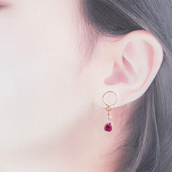 今回は、ルビー(ペアシェイプファセットカット)と、ハーキマーダイヤを組み合わせたノンホールピアスに仕上げました。普段使いにもお出かけにもお使いいただけます。