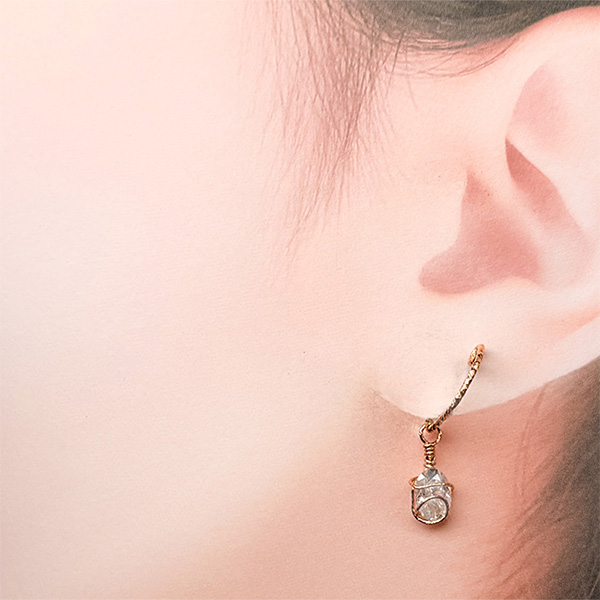 今回はオーバルファセットカットのモアサナイトで、高品質なルース(穴が空いていない石)を入手しましたので、ワイヤーワークで石を留めてノンホールピアスに仕上げました。